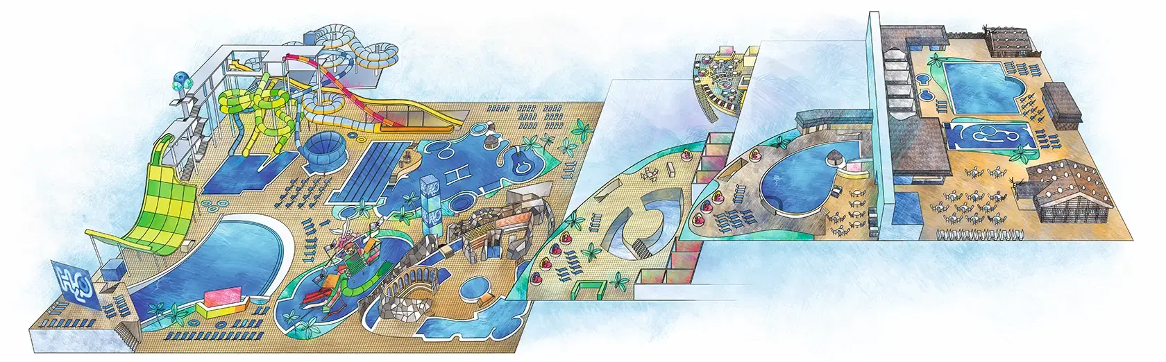 Оказавшись в комплексе H2O, Вы погружаетесь в мир курортного отдыха с невероятным природным ландшафтом жарких стран. Пальмы, деревья и другая растительность превращают аквапарк в райский оазис среди каменных джунглей шумного города.
